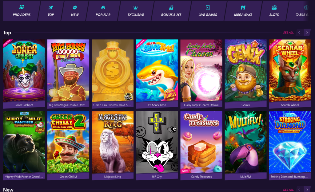 • 🎮 Une collection très riche de plus de 11 500 jeux, incluant machines à sous, jeux live et tables classiques