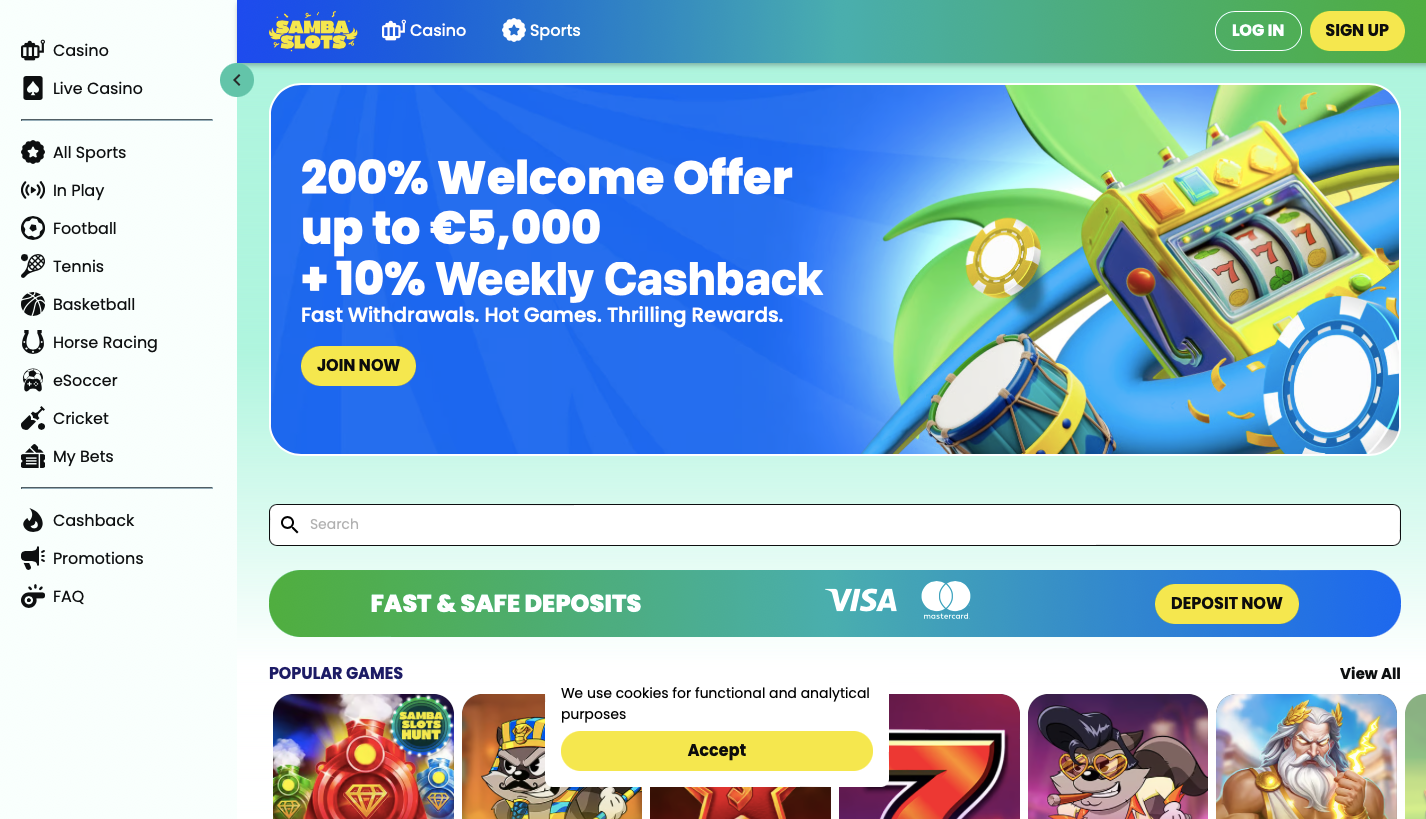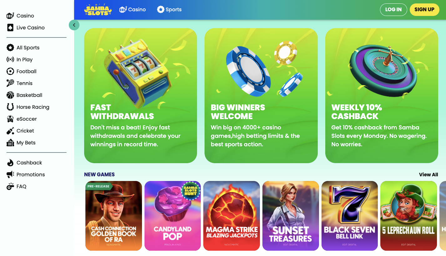 Dès l’arrivée sur le site, il est impossible de ne pas être absorbé par l’ambiance festive signée Samba Slots Casino. L’expérience utilisateur est soignée avec des raccourcis clairs menant directement vers les zones phares : jeux traditionnels, sessions en direct, ou espaces dédiés aux paris sportifs. La navigation intuitiveséduit même les personnes moins habituées aux plateformes numériques.